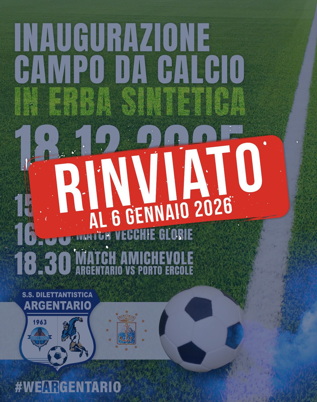 L'inaugurazione del nuovo manto in erba sintetica del campo sportivo di Porto S. Stefano previsto per il giorno 18 dicembre è stato rinviato al 6 gennaio 2026 causa avverse condizioni meteo
