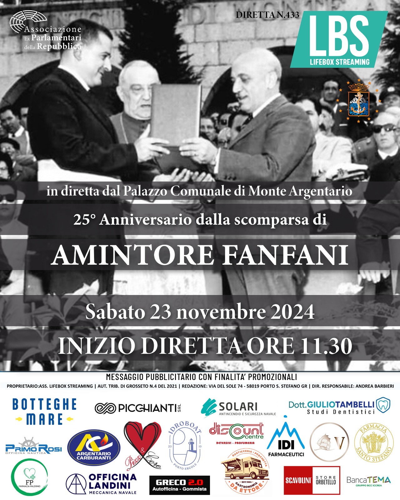 L’iniziativa promossa dall'Associazione degli ex Parlamentari della Repubblica è patrocinata dal Comune di Monte Argentario, di cui Fanfani è stato cittadino onorario.