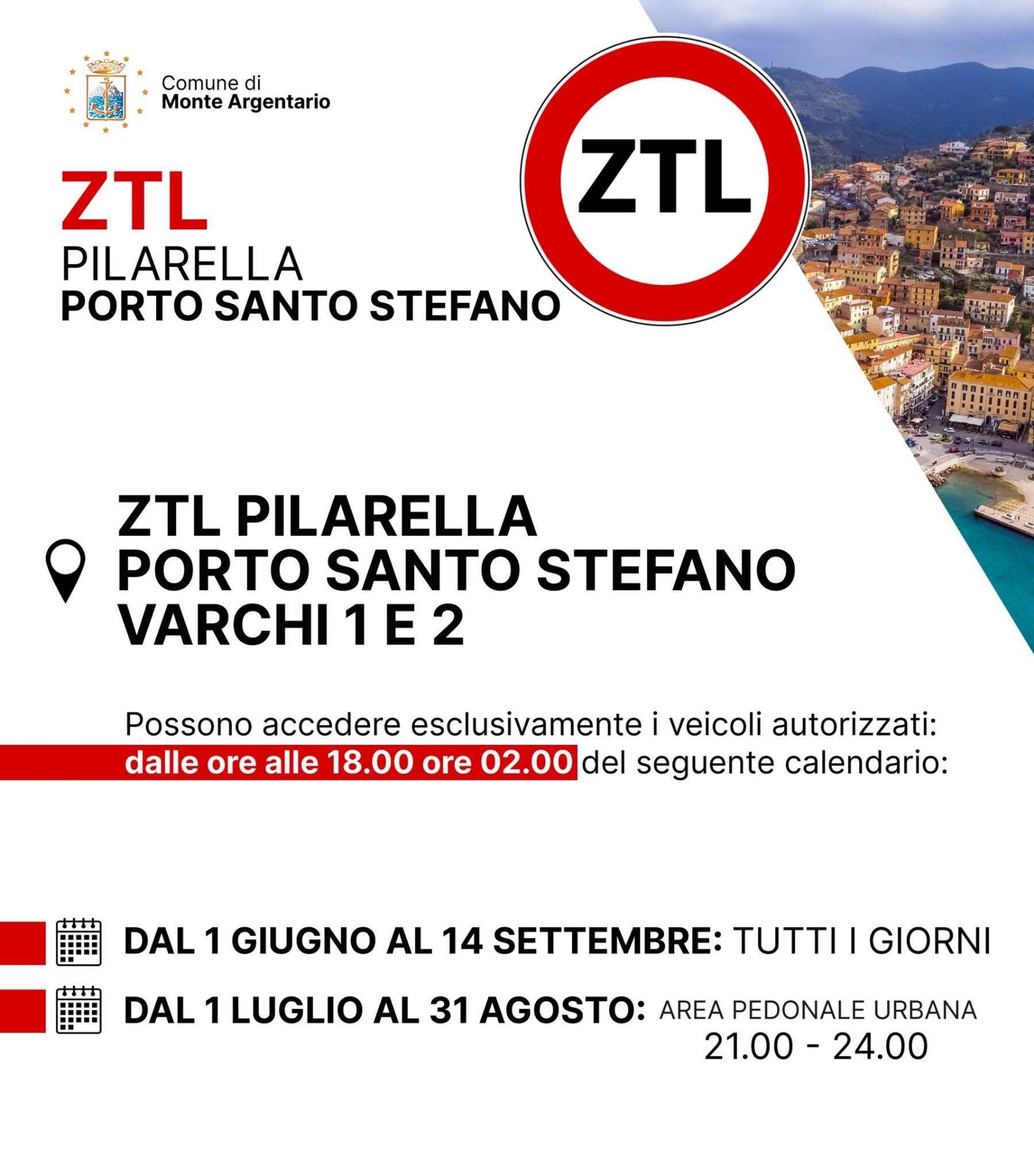 L’accesso alla ZTL “Porto” in Porto Ercole, (varchi 1 e 3) sarà consentito esclusivamente ai veicoli autorizzati per i rispettivi varchi, nella fascia oraria: dalle ore 18,00 alle ore 24,00 secondo il calendario così individuato: