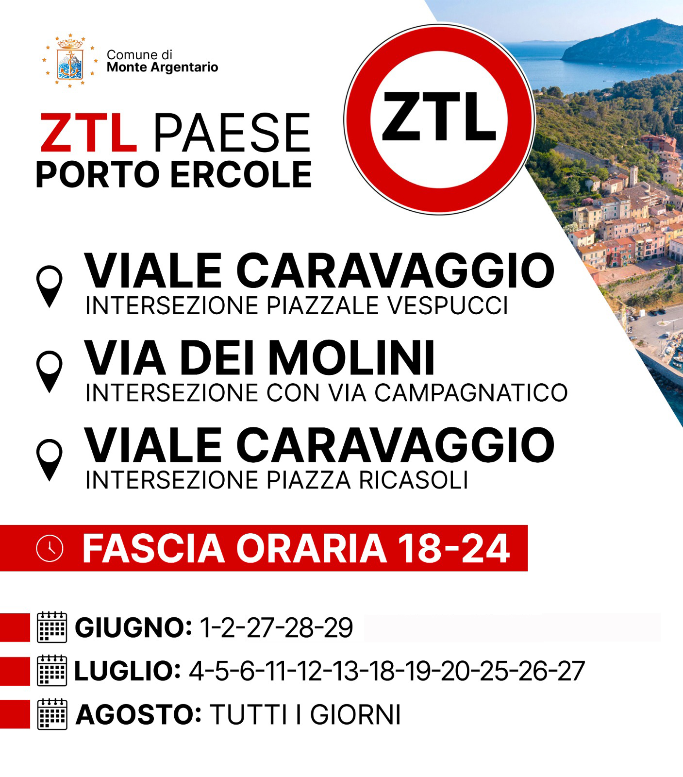 L’accesso alla ZTL “Porto” in Porto Ercole, (varchi 1 e 3) sarà consentito esclusivamente ai veicoli autorizzati per i rispettivi varchi, nella fascia oraria: dalle ore 18,00 alle ore 24,00 secondo il calendario così individuato: