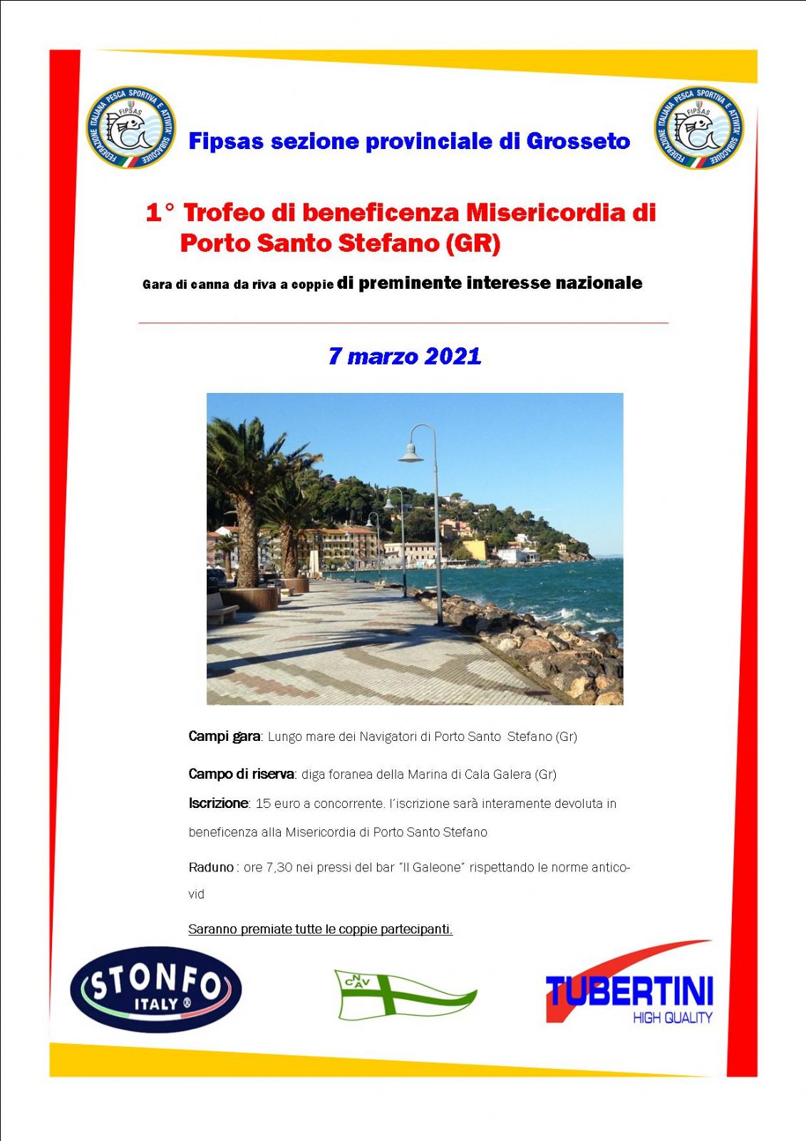 La FIPSAS sezione provinciale di Grosseto organizza per il giorno 07/03/2021 il 1° trofeo di beneficenza "Misericordia di Porto S. Stefano - Gara di canna da riva a coppia, che si terrà a Porto Santo Stefano - Lungomare dei Navigatori