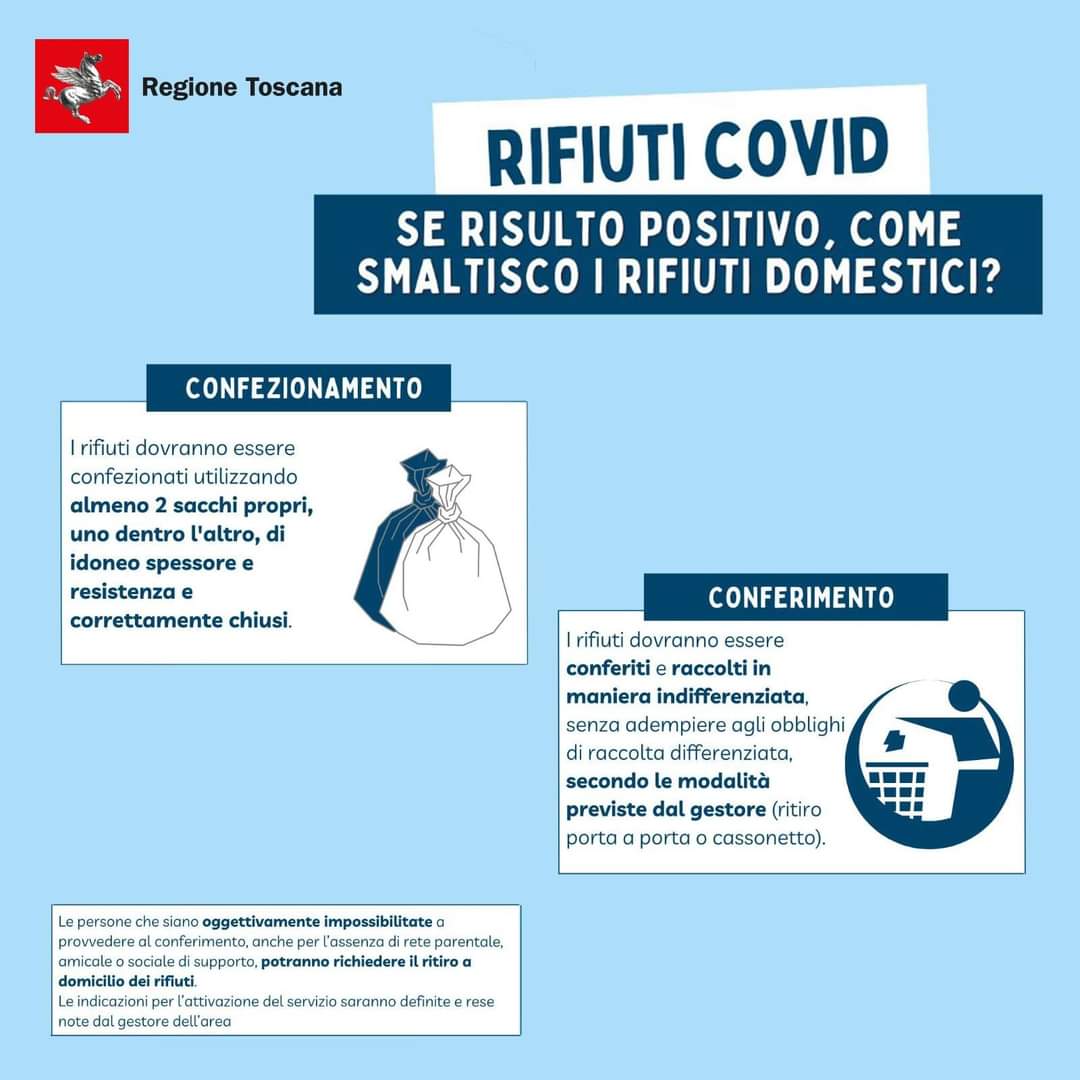 A seguito dell’ordinanza della Regione Toscana n.3 dell’11/01/2022, si avvisa che non è più prevista la raccolta a domicilio dei rifiuti per le persone positive al Covid -19 in isolamento domiciliare. I rifiuti dovranno essere pertanto conferiti tramite il normale servizio previsto di raccolta stradale o domiciliare, senza però effettuare la raccolta differenziata e utilizzando almeno due sacchi uno dentro l’altro.