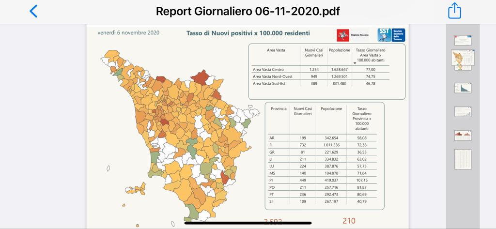 Le organizzazioni sanitarie, nel nostro caso l’ASL Toscana Sud Est che comprende le province di Arezzo, Grosseto e Siena, si dannano per arginare questa nuova e poderosa onda d’urto. Prefetture e Regione Toscana hanno iniziato un puntuale censimento di strutture ricettive alternative agli ospedali, per dare ospitalità ai soggetti asintomatici o paucisintomatici colpiti dalla pandemia e far loro scontare in queste strutture il periodo di quarantena. Insieme all’incremento dei casi positivi bisogna riscontrare anche il conseguente incremento dei contatti che, con essi, hanno avuto rapporti e che debbono essere posti in isolamento cautelativo prima e controllati con processo di tamponi dopo. E’ un grande impegno che viene richiesto sia, ovviamente, alla organizzazione sanitaria ma anche alle forze di polizia che, con frequenza bigiornaliera, sono chiamate al controllo del rispetto della quarantena sia dei casi positivi che dei loro contatti. Tenete conto che, nel caso del nostro Comune, che per fortuna è tra quelli percentualmente meno colpiti dalla diffusione del virus (allo scopo si allega planimetria della Regione Toscana dove si evince la colorazione verde di M.Argentario) i casi da trattare superano il centinaio.