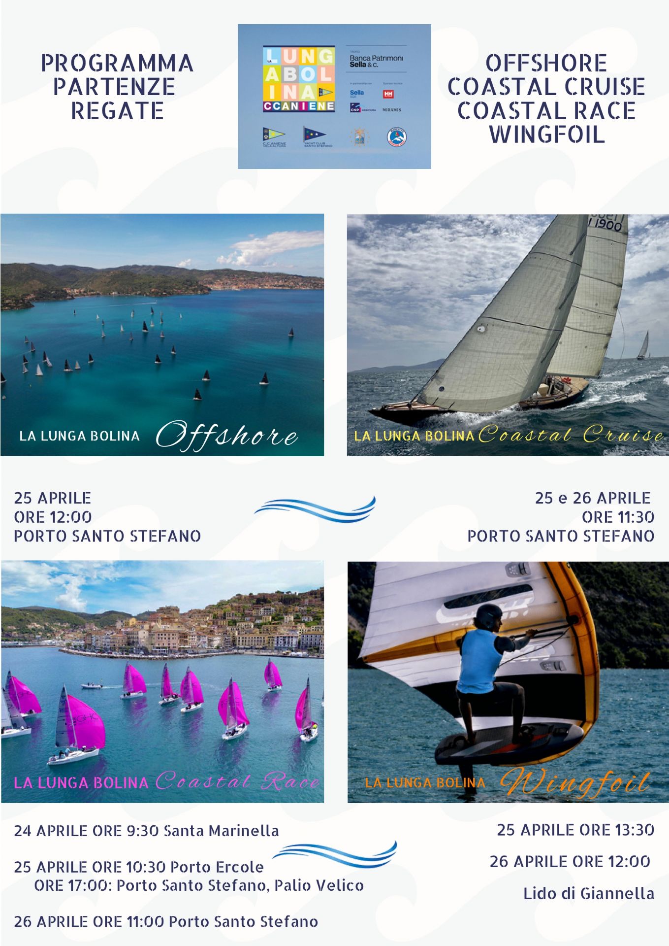 Tra i momenti centrali del programma si inserisce la Coastal Cruise de La Lunga Bolina – Trofeo Banca Patrimoni Sella una regata costiera su percorsi giornalieri compresi tra le 15 e le 25 miglia, pensata per equipaggi e imbarcazioni che desiderano vivere la competizione senza affrontare navigazioni notturne.