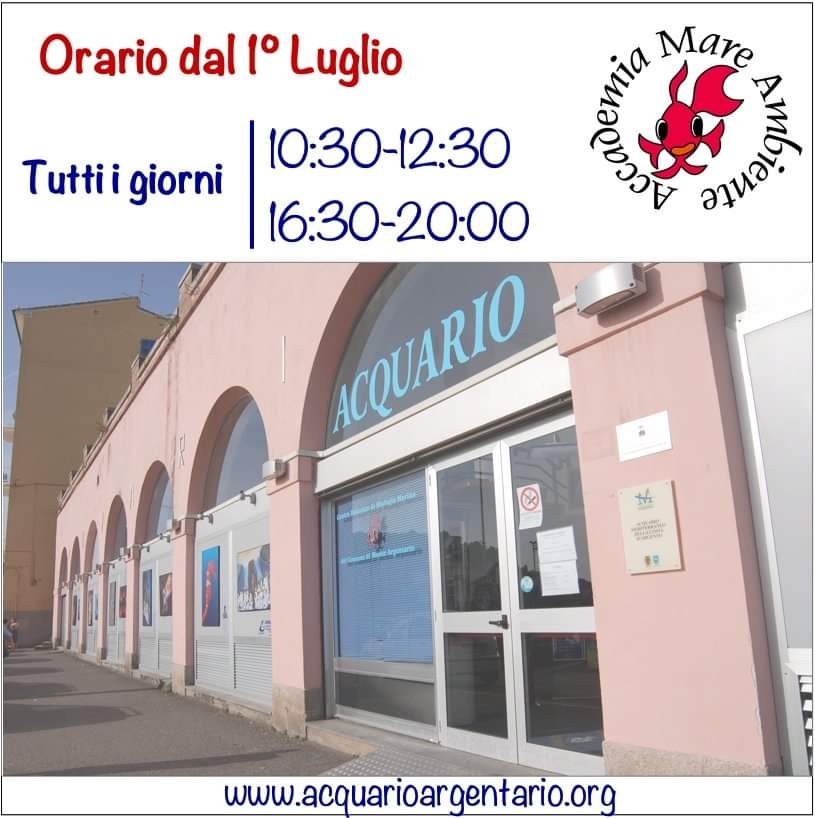 L'Acquario Mediterraneo dell'Argentario situato sul Lungomare dei Navigatori di Porto S.Stefano,gestito da Accademia Mare Ambiente, dal mese di luglio cambia così l’orario di apertura al pubblico :