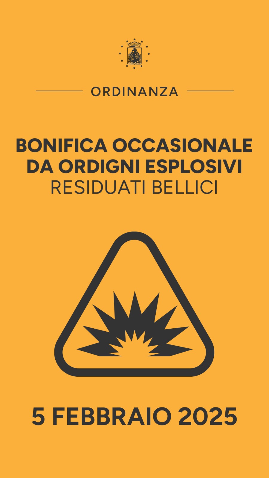 - l’evacuazione temporanea di tutta la popolazione della zona individuata sulla strada Panoramica al foglio n. 5 particella 86 del catasto, con distanza di sgombero di 200 metri. Le operazioni di sgombero di quell’area dovranno avere inizio alle ore 7:00 del 5 febbraio e concludersi al termine delle operazioni. L’area dovrà mantenersi evacuata fino all’avvenuto allontanamento della bomba;