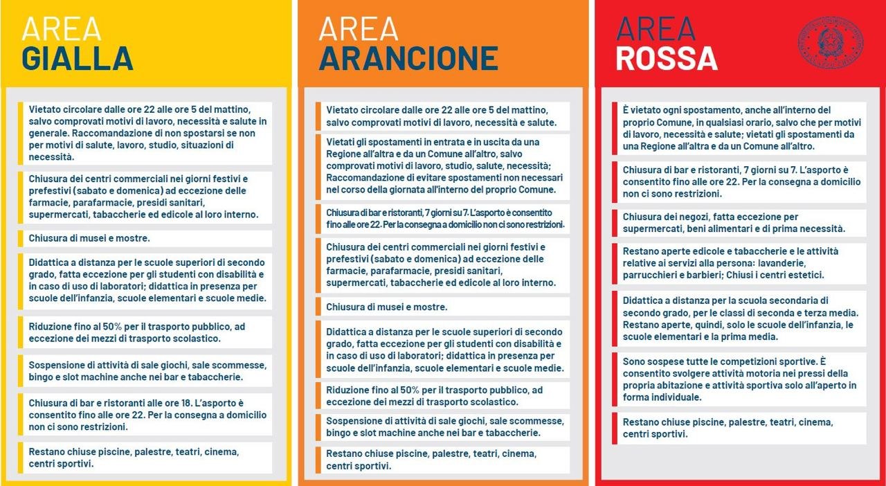 Il Presidente del Consiglio ha emanato un nuovo DPCM (il quarto dall’inizio della ripresa dell’incremento pandemico) che prevede particolari restrizioni collegate all’andamento del contagio epidemiologico regione per regione. Sono state identificate tre colorazioni (gialla – arancione –rossa) e le varie regioni inserite in esse secondo un algoritmo predefinito che tiene conto di vari elementi socio-sanitari. A diversa colorazione sono collegate diverse restrizioni. Ad oggi la nostra Regione Toscana è tra quelle di colorazione gialla e quindi c’è da sperare che non vi siano significative modifiche dell’andamento pandemico tali da modificarne la colorazione. Per meglio capire allego alla presente lo schema con indicate le attuali classificazioni cromatiche delle regioni e il tasso di limitazioni relativamente conseguente.