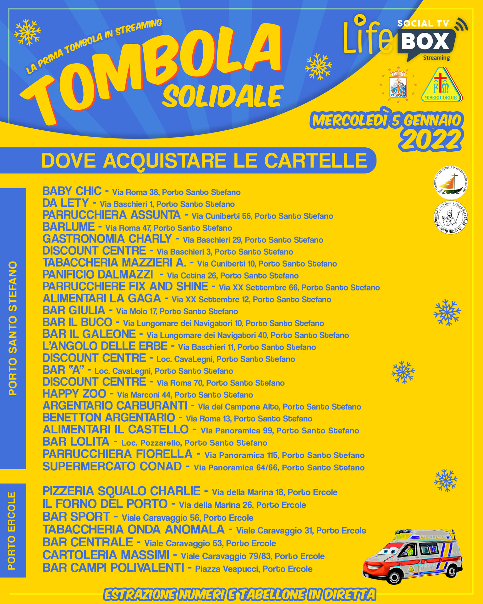 La prima “tombola solidale” dell’Argentario in diretta streaming mercoledì 5 gennaio 2022 alle ore 20,45. E’ questa l’iniziativa messa in campo dalla Confraternita di Misericordia di Porto S.Stefano e da Lifebox Streaming, la piattaforma on line che da oltre un anno accompagna con le sue dirette live gli eventi ed i momenti più significativi della comunità argentarina. Con il patrocinio del Comune di Monte Argentario e la collaborazione delle Parrocchie di Porto S. Stefano e Porto Ercole la tombola rientra nella campagna “un’ambulanza per l’Argentario” lanciata dalla stessa Confraternita per raccogliere fondi per l’acquisto di un nuovo mezzo da destinare al servizio territoriale di emergenza-urgenza.