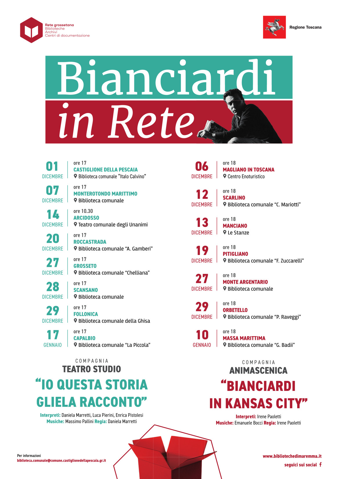 Accanto allo spettacolo “Bianciardi in Kansas city”, la Rete delle biblioteche propone anche “Io questa storia gliela racconto” della compagnia Teatro Studio in programma fino al 17 gennaio a Monterotondo Marittimo, Arcidosso, Roccastrada, Grosseto, Scansano, Follonica e Capalbio.