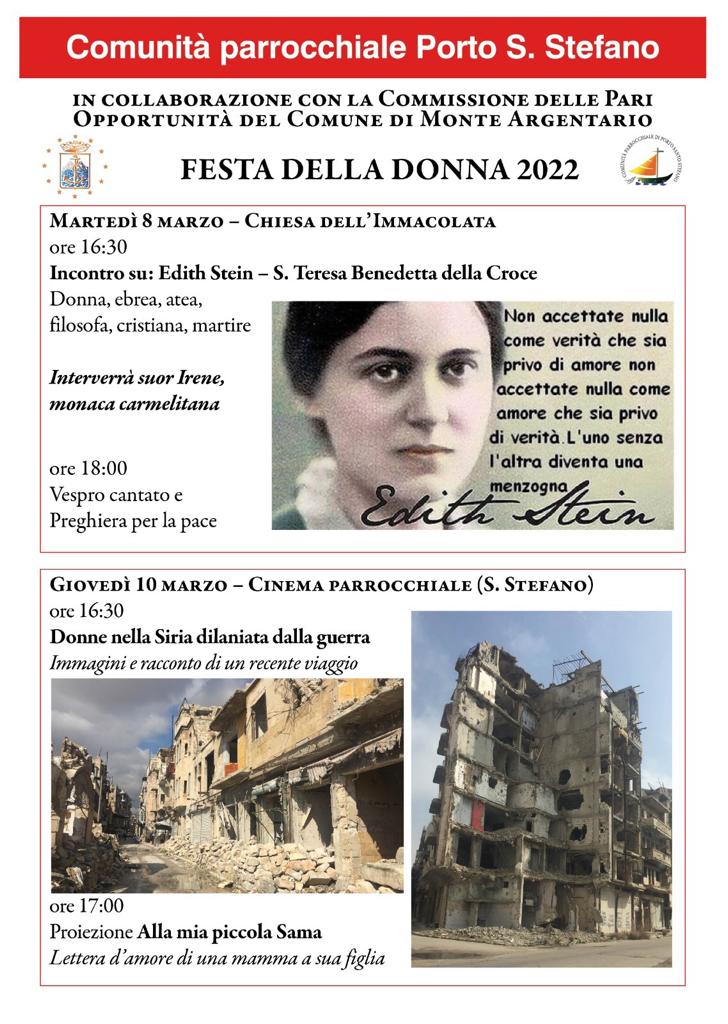 In occasione della festa della donna la Parrocchia di Porto S.Stefano, in collaborazione con la Commissione Pari Opportunità e con il patrocinio del Comune, organizza due iniziative che, in questo momento tragico della guerra in Ucraina, vogliono essere un invito a ricordare e riflettere sul conflitto in Siria dove soprattutto le donne e i bambini hanno maggiormente sofferto e ancora soffrono per la stupidità della guerra.