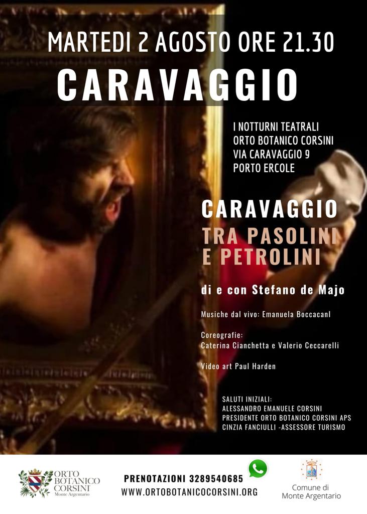 Nell’ambito della rassegna “I notturni teatrali” che si sta svolgendo all’Orto Botanico Corsini di Porto Ercole è in programma martedì 2 agosto alle ore 21.30 una serata dedicata a Caravaggio. L’evento, ideato e condotto da Stefano de Majo, è un percorso di arte, teatro, letteratura tra Caravaggio, Pasolini e Petrolino, vite al limite, tra luci ed ombre, tra vortici oscuri e ascese straordinarie, personalità anticonformista che hanno lottato contro pregiudizi ed emarginazione.