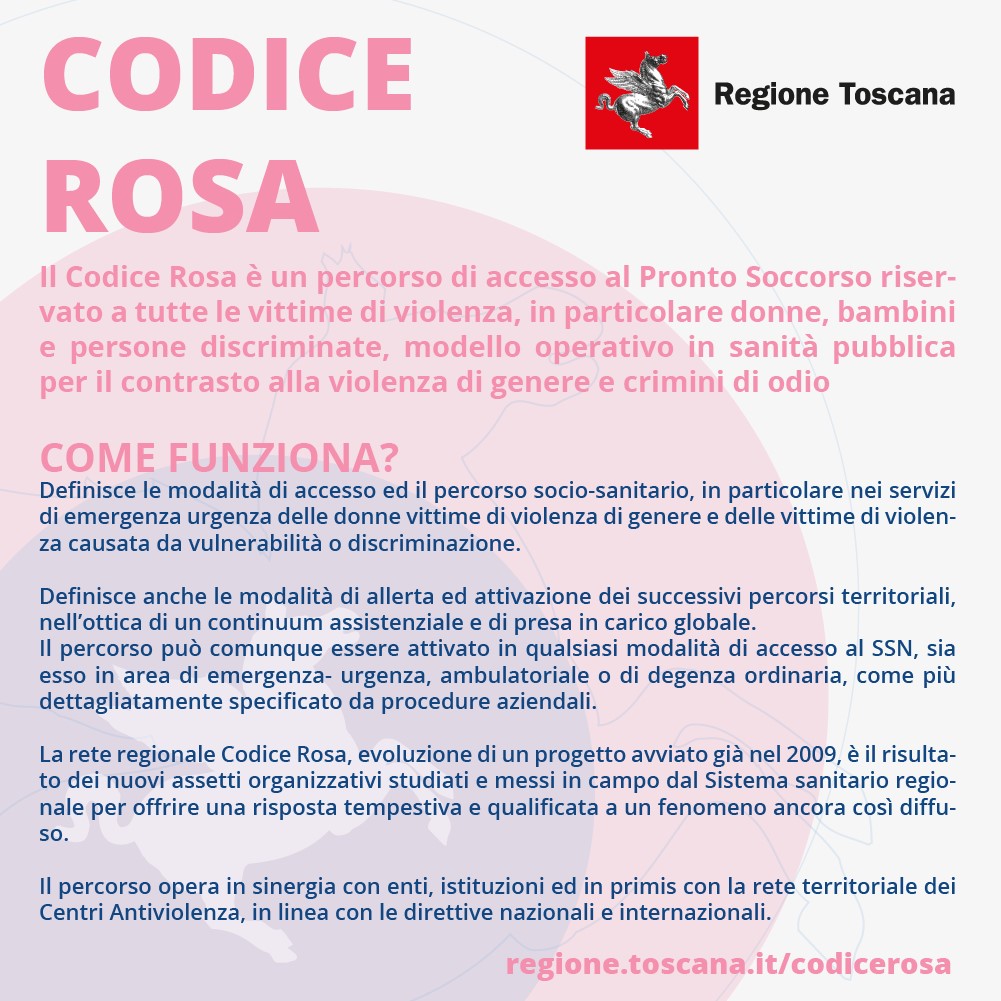 Codice Rosa: protezione immediata per chi subisce violenza. Il Codice Rosa è un percorso di accesso ai Pronto Soccorso della Regione Toscana riservato a tutte le vittime di violenza, in particolare donne, bambini e persone discriminate.