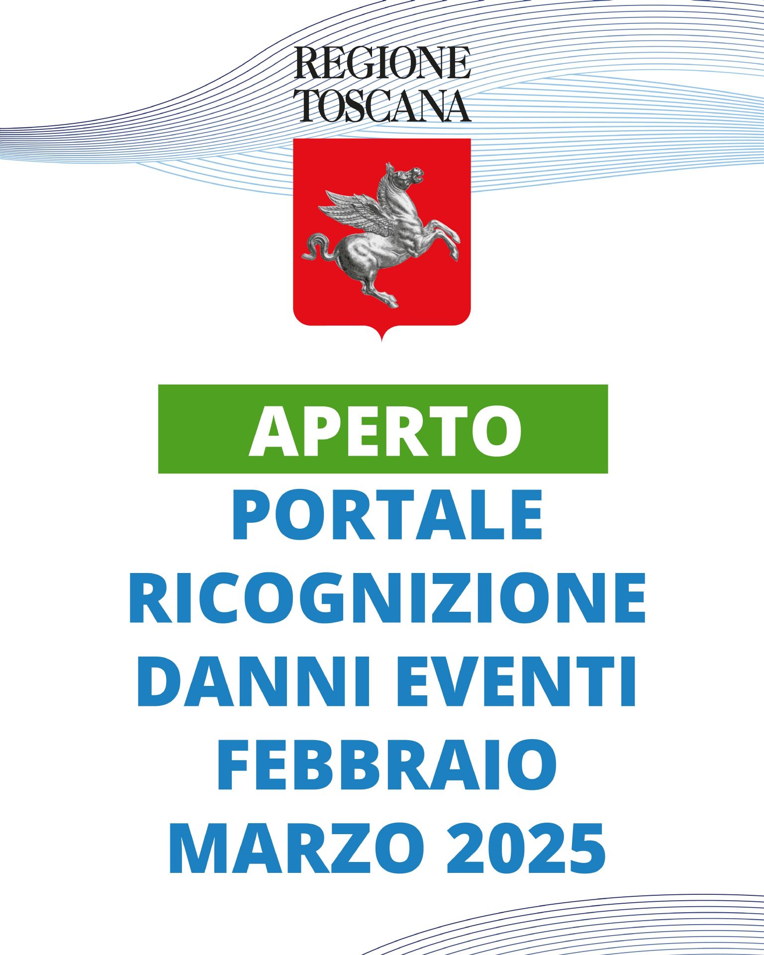 Si informa che è attivo il portale della Regione Toscana per la ricognizione dei danni e domanda di contributo per privati, attività produttive e attività agricole a seguito degli eventi meteorologici verificatisi nei giorni dal 12 al 14 febbraio 2025 e relativi ai territori dei Comuni di Isola del Giglio, di Monte Argentario e di Orbetello della Provincia di Grosseto, di Campo nell'Elba, di Marciana, di Portoferraio e di Rio della Provincia di Livorno, di Castelnuovo in Garfagnana della Provincia di Lucca e di Montale, di Montemurlo, di Lamporecchio e di Larciano della Provincia di Pistoia e dal 14 marzo 2025 nei territori della Città metropolitana di Firenze e delle Province di Livorno, di Lucca, di Pisa, di Pistoia e di Prato.