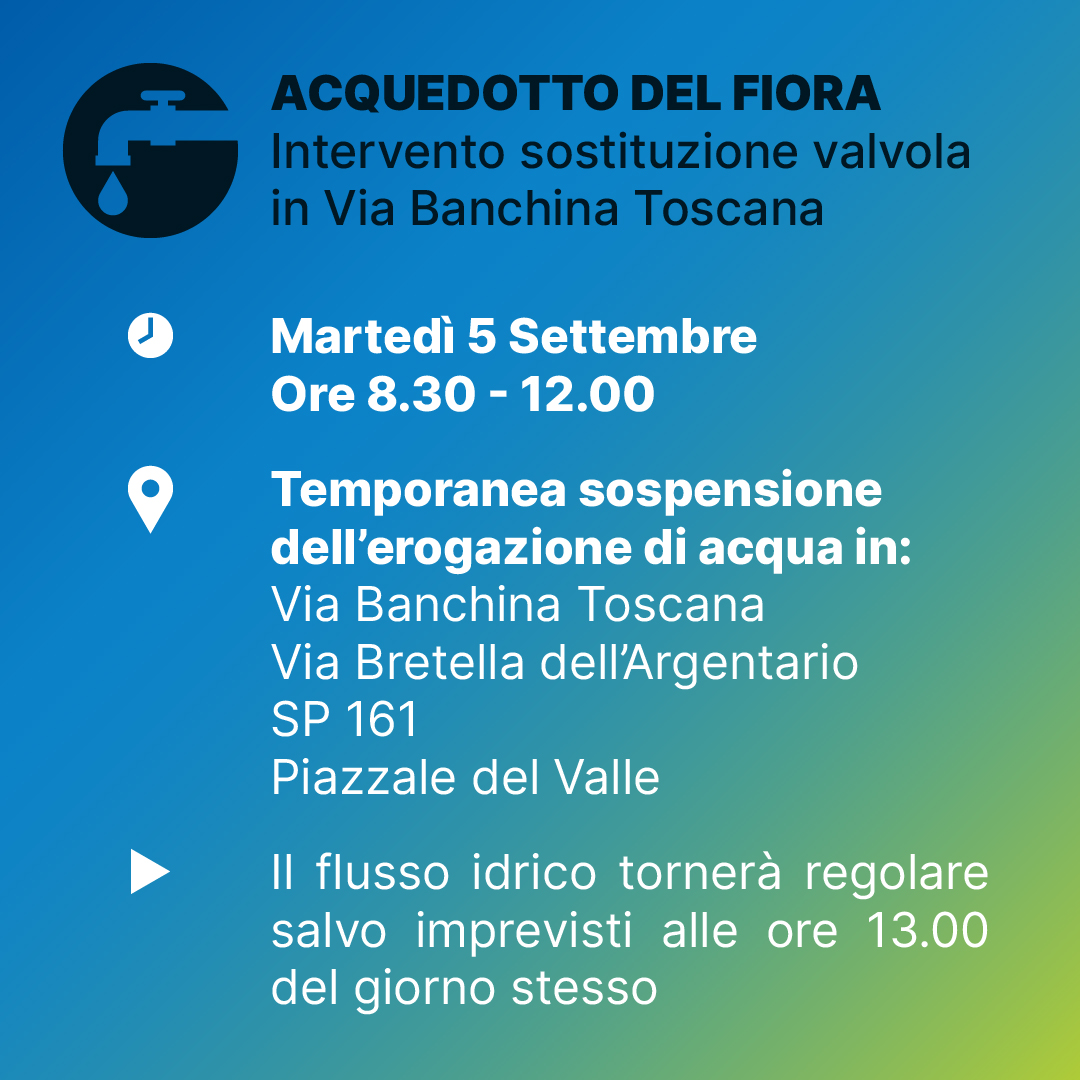 Acquedotto del Fiora ha comunicato che martedì 5 settembre effettuerà un intervento per la sostituzione di una valvola presso la Banchina Toscana a Porto S.Stefano che comporterà una interruzione del flusso idrico, dalle ore 8:30 alle ore 12:00, nelle seguenti località :