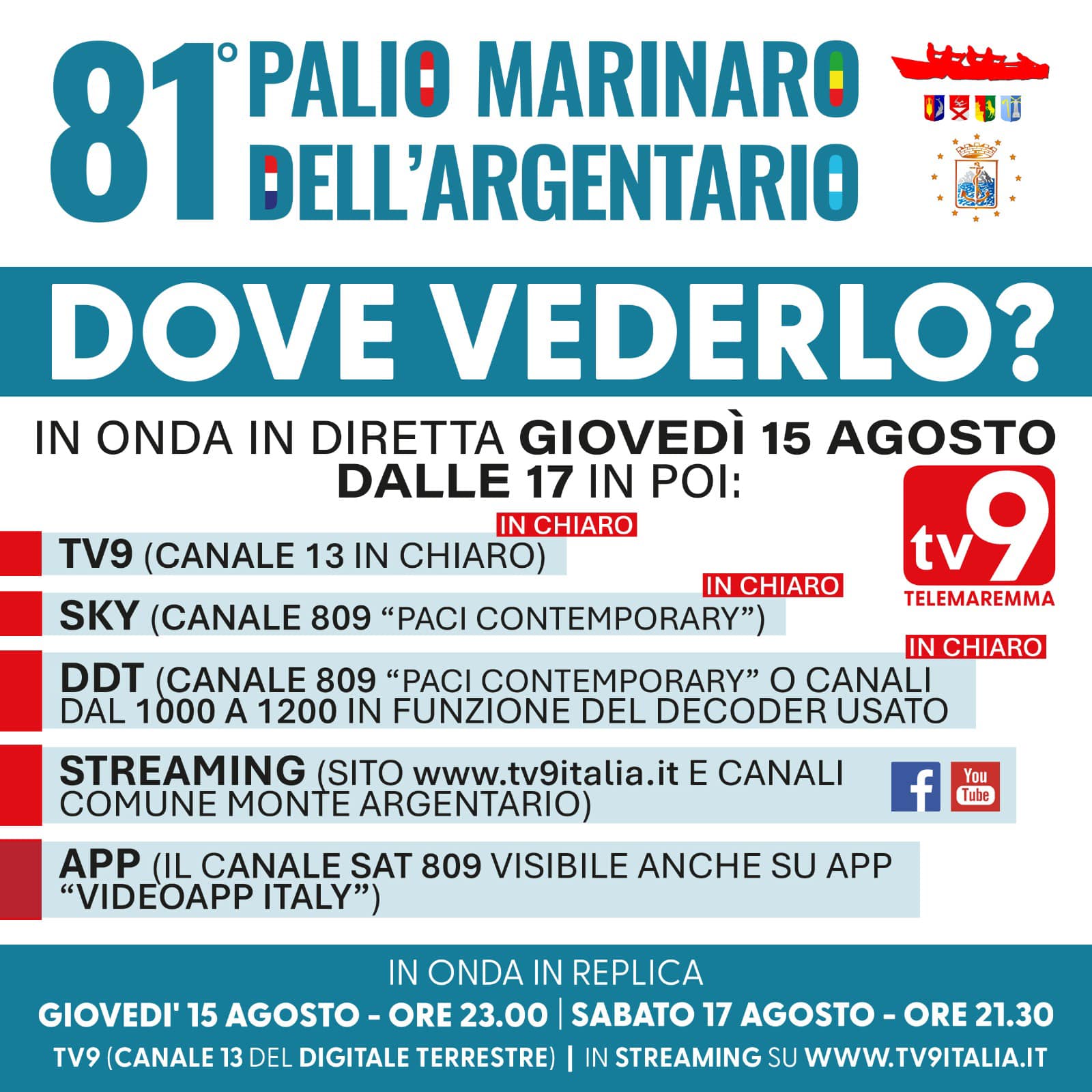 L’ 81° Palio Marinaro sarà in diretta televisiva dalle ore 17:00 del 15 agosto sui seguenti canali :