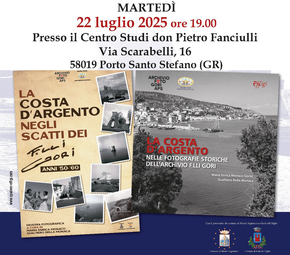 Verrà inaugurata martedì 22 luglio alle ore 19.00 nella sede del Centro Studi Don Pietro Fanciulli a Porto S. Stefano la mostra fotografica "La Costa d’Argento nelle foto dei Fratelli Gori" che resterà aperta al pubblico tutti i giorni fino al 13 agosto. L’esposizione è curata dal presidente del Centro Studi, Gualtiero Della Monaca e da Maria Enrica Monaco Gorni, vicepresidente dell’Archivio Fotografico F.lli Gori che saranno presenti al vernissage assieme al moderatore, il giornalista Paolo Mastracca. Contestualmente, verrà presentato il libro “La Costa D’Argento nelle fotografie storiche dell’archivio f.lli Gori” a cura degli stessi Della Monaca e Gorni ed edito da Effigi. L’iniziativa, patrocinata dai Comuni di Monte Argentario e Isola del Giglio, rappresenta un vero e proprio “viaggio” nelle località della Costa D’Argento in un periodo che ha segnato per le stesse un profondo cambiamento.