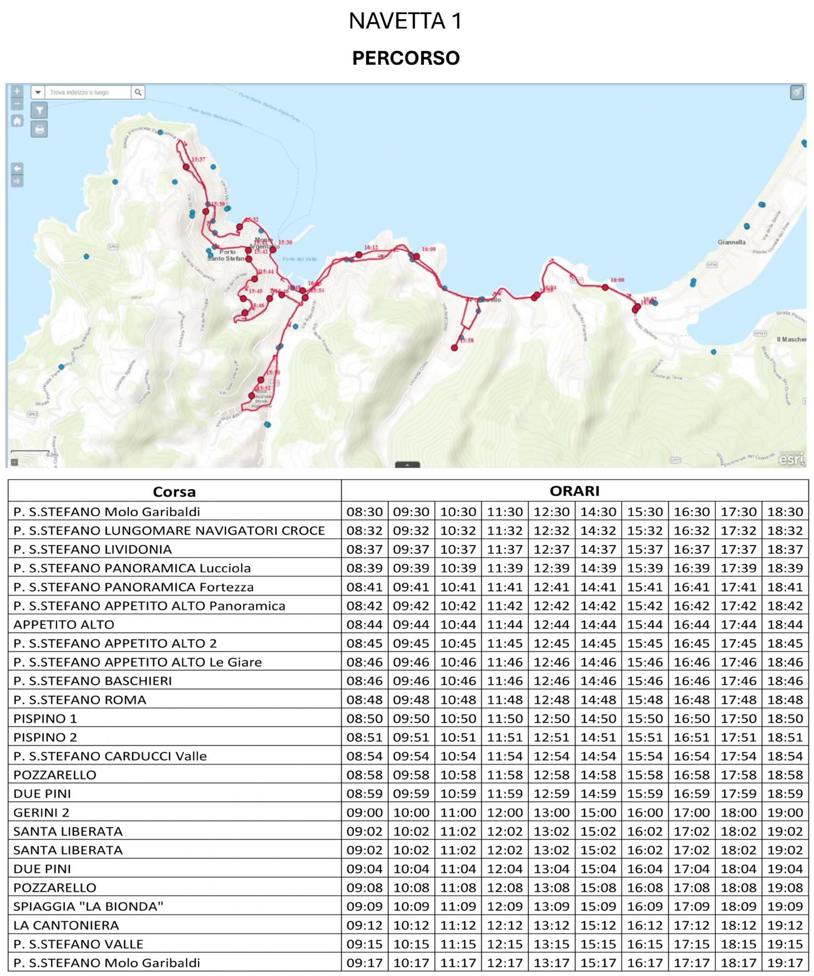 bus navetta 1 orario 08:30-19:17 Porto S. Stefano: Molo Garibaldi, Lungomare Navigatori Croce, Lividonia, Lucciola, Fortezza, Appetito Alto, Via Baschieri, Via Roma, Pispino, Valle (Via Carducci), Pozzarello, Due Pini, Gerini, Santa Liberata, Due Pini, Spiaggia “La Bionda”, Cantoniera, Valle, Molo Garibaldi.