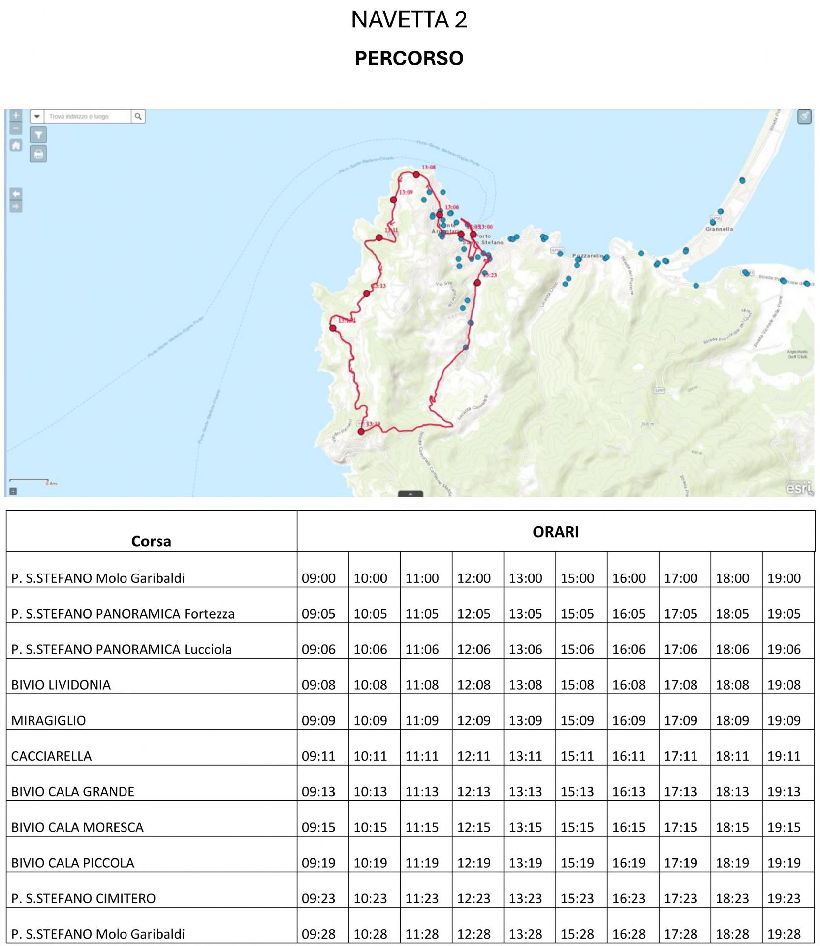bus navetta 2 orario 09:00 – 19:28 Porto S. Stefano: Molo Garibaldi, Fortezza, Lucciola, Lividonia, Miragigli, Cacciarella, Bivio Cala Grande, Bivio Cala Moresca, Bivio Cala Piccola, Cimitero Porto S.Stefano, Molo Garibaldi.