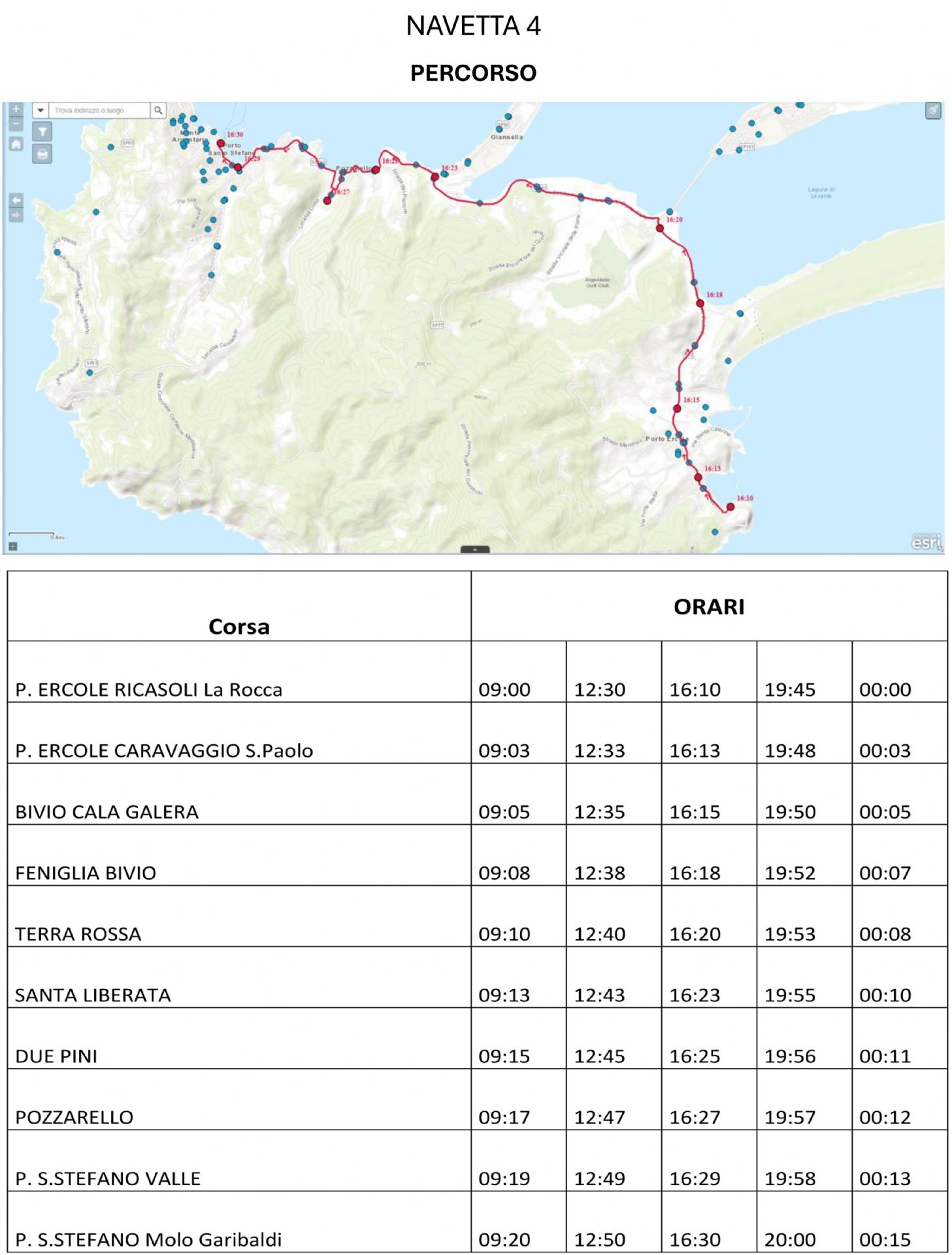 bus navetta 4 orario 09:00 – 00:15 Porto Ercole e Porto Santo Stefano: Piazza Ricasoli, Viale Caravaggio (S.Paolo), Bivio Cala Galera, Bivio Feniglia, Terra Rossa, Santa Liberata, Due Pini, Pozzarello, Valle, Molo Garibaldi.