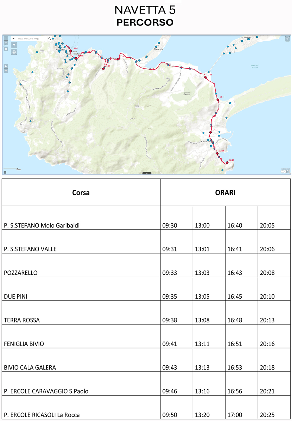 bus navetta 5 orario 09:30 – 20:25 Porto Santo Stefano e Porto Ercole : Molo Garibaldi, Valle, Pozzarello, Due Pini, Terra Rossa, Bivio Feniglia, Bivio Cala Galera, Viale Caravaggio (S.Paolo), Piazza Ricasoli.