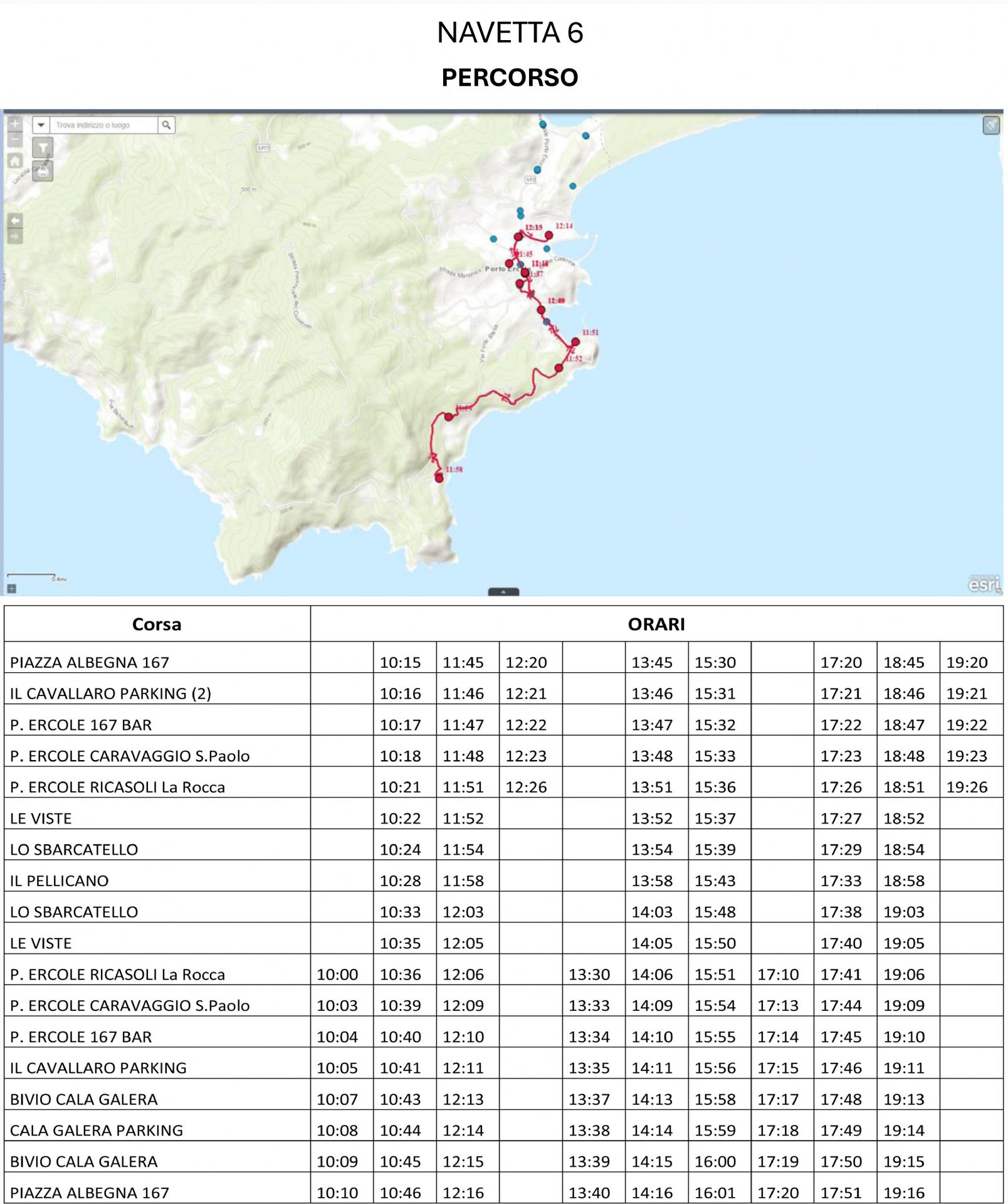 bus navetta 6 orario 10:00 - 19:26 Porto Ercole: Piazza Albegna, Parcheggio “Il Cavallaro”, Via dello Scirocco, Viale Caravaggio (S.Paolo), Piazza Ricasoli, Le Viste, Lo Sbarcatello, Il Pellicano, - Lo Sbarcatello, Le Viste, Piazza Ricasoli Viale Caravaggio (S.Paolo), Via dello Scirocco, Bivio Cala Galera, Parcheggio Cala Galera, Bivio Cala Galera, Piazza Albegna