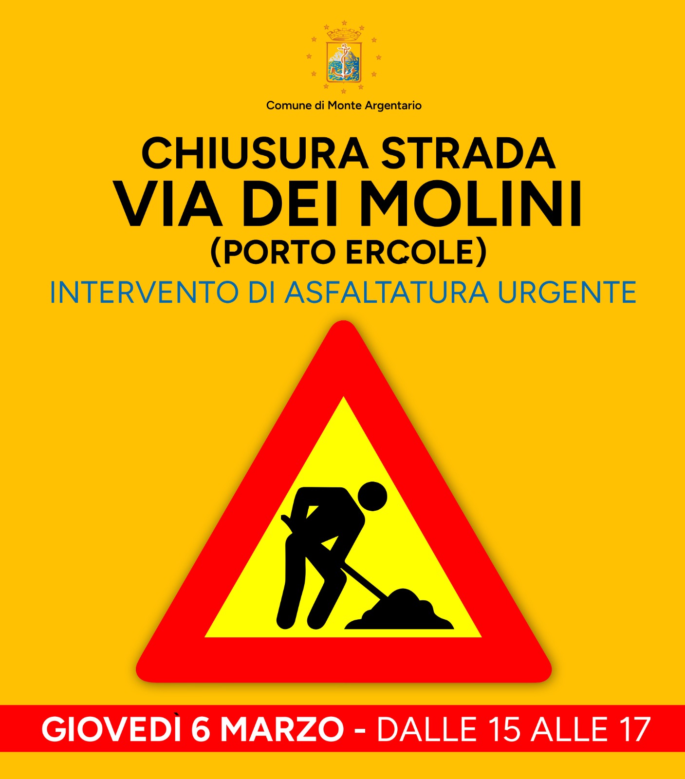 Si avvisa la polazione che oggi, 6 marzo, dalle ore 15 alle 17 via dei Molini a Porto Ercole sarà chiusa al transito per lavori di asfaltatura urgente