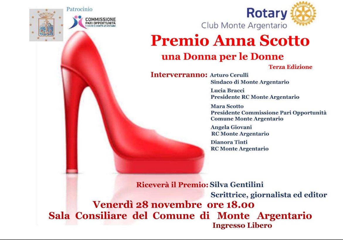 Il premio, organizzato dal Rotary Club Monte Argentario, è nato nel 2023 in memoria dell’avvocato Anna Scotto, che a soli 59 anni si è dovuta arrendere ad una terribile malattia. Molto conosciuta, ha sempre sostenuto i diritti delle donne nella professione e nella vita sociale, come componente della Commissione pari opportunità del Comune di Monte Argentario e come socia del Rotary Club Monte Argentario, dove ha ricoperto anche la carica di presidente. Quest’anno il Premio, un’esclusiva creazione in ceramica dell’artista Doriana Melosini raffigurante una scarpetta rossa, verrà consegnato a Silva Gentilini, editor, ghostwriter e scrittrice per Piemme e Mondadori.